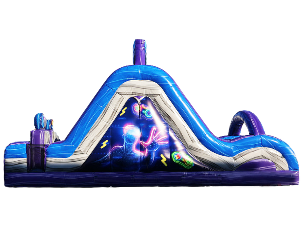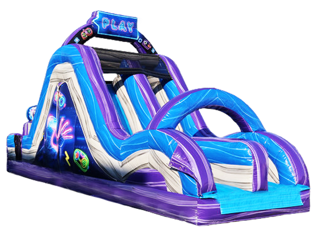 Complete with bright gaming graphics, a challenging rock climb wall and two steep sliding lanes, our 18′ Gamer Double Lane Dry Slide promises to deliver lots of excitement at your next party or event.