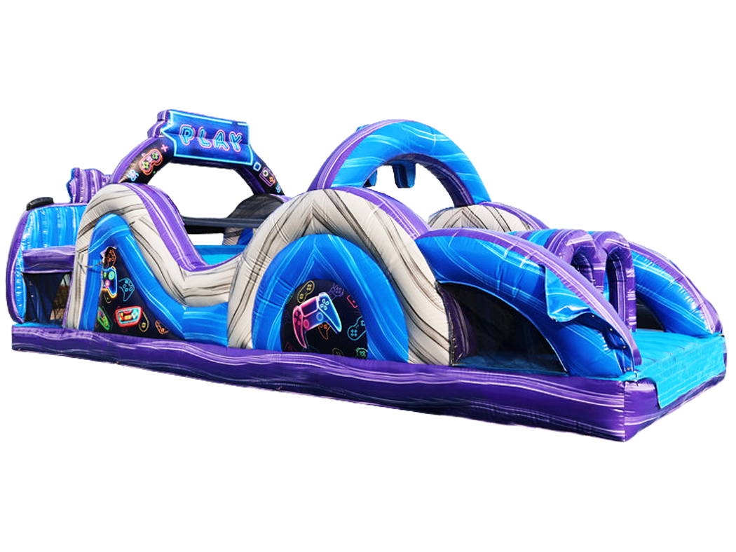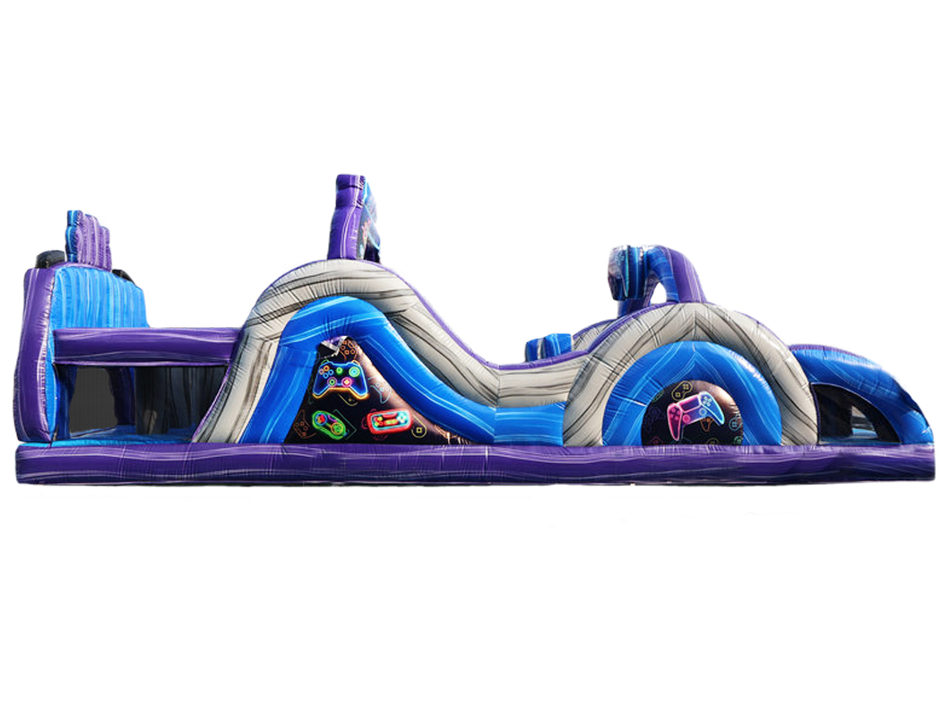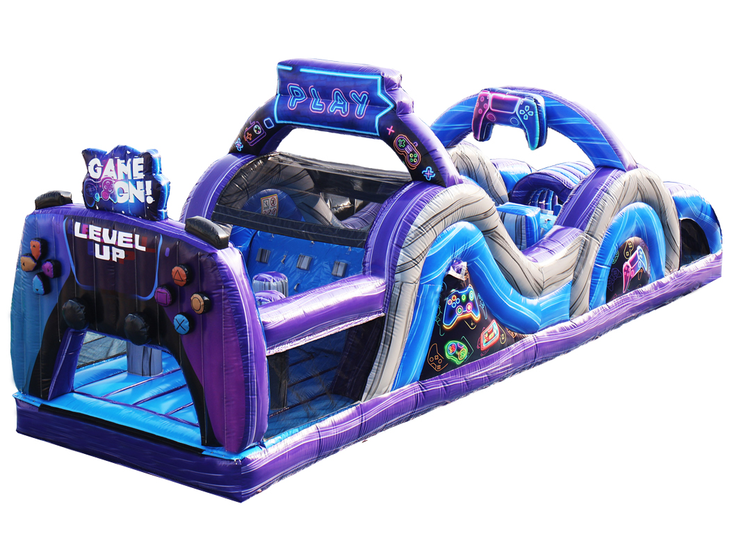Our 35′ Level Up Obstacle Course features two individual racing lanes for a friendly competition style race. Its stunning graphics and 3D gaming pop-ops make it a one-of-a-kind piece that will leave your guests talking!