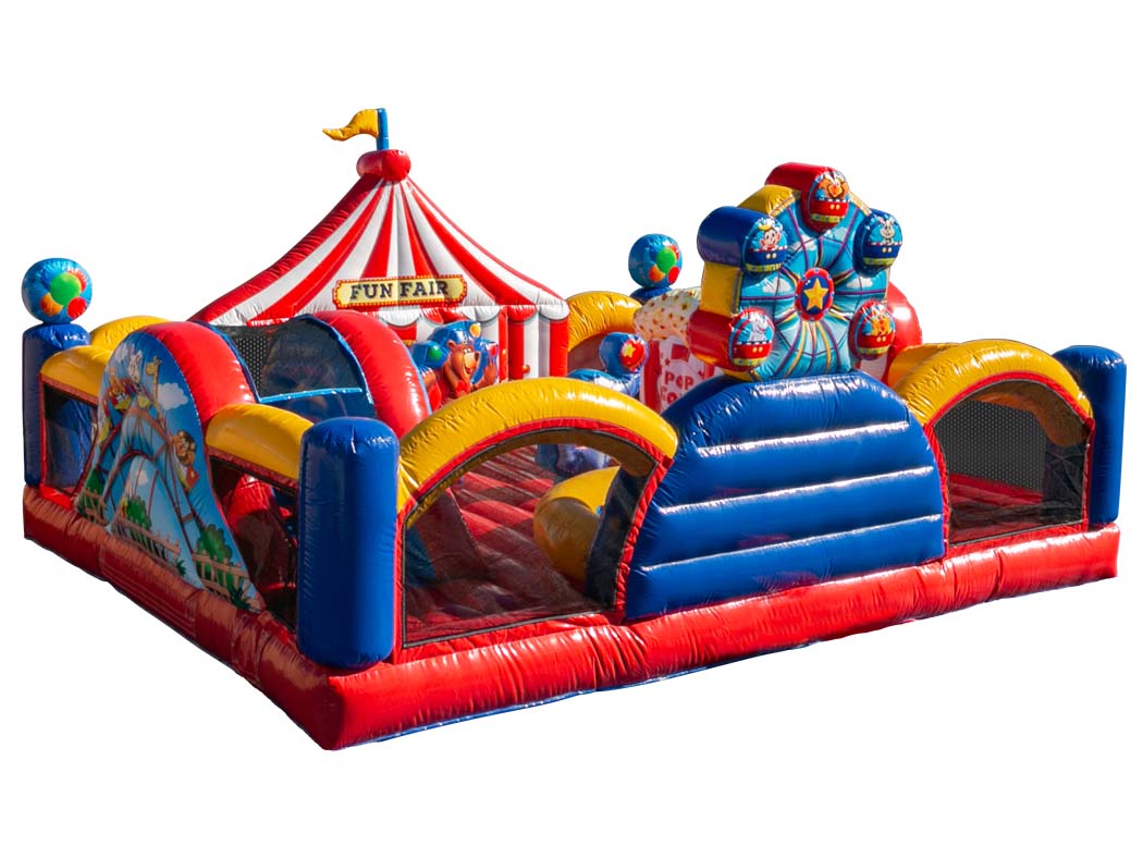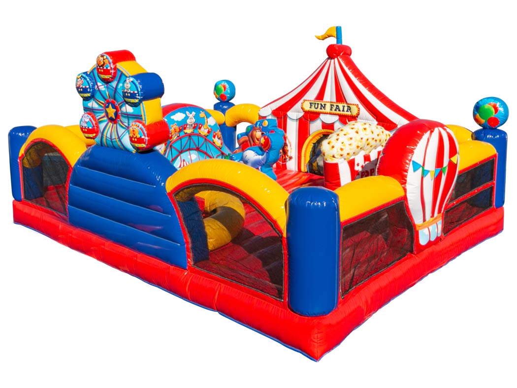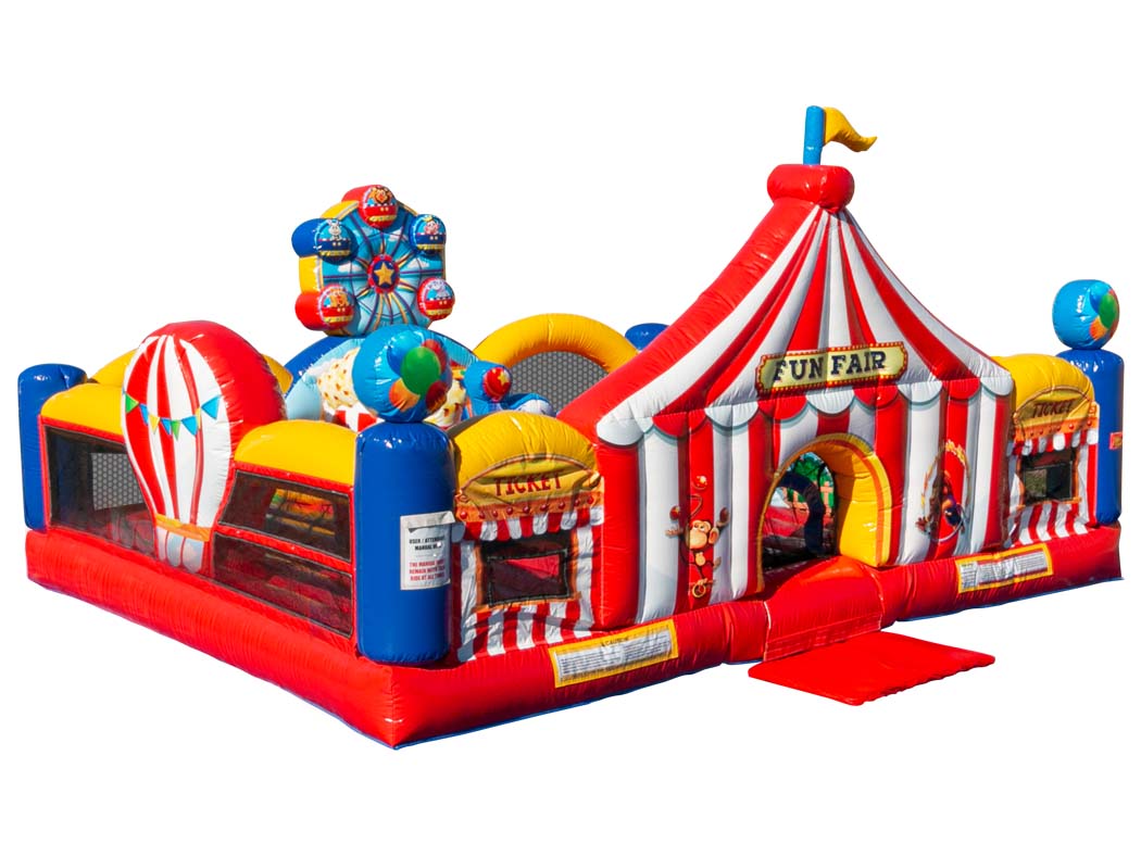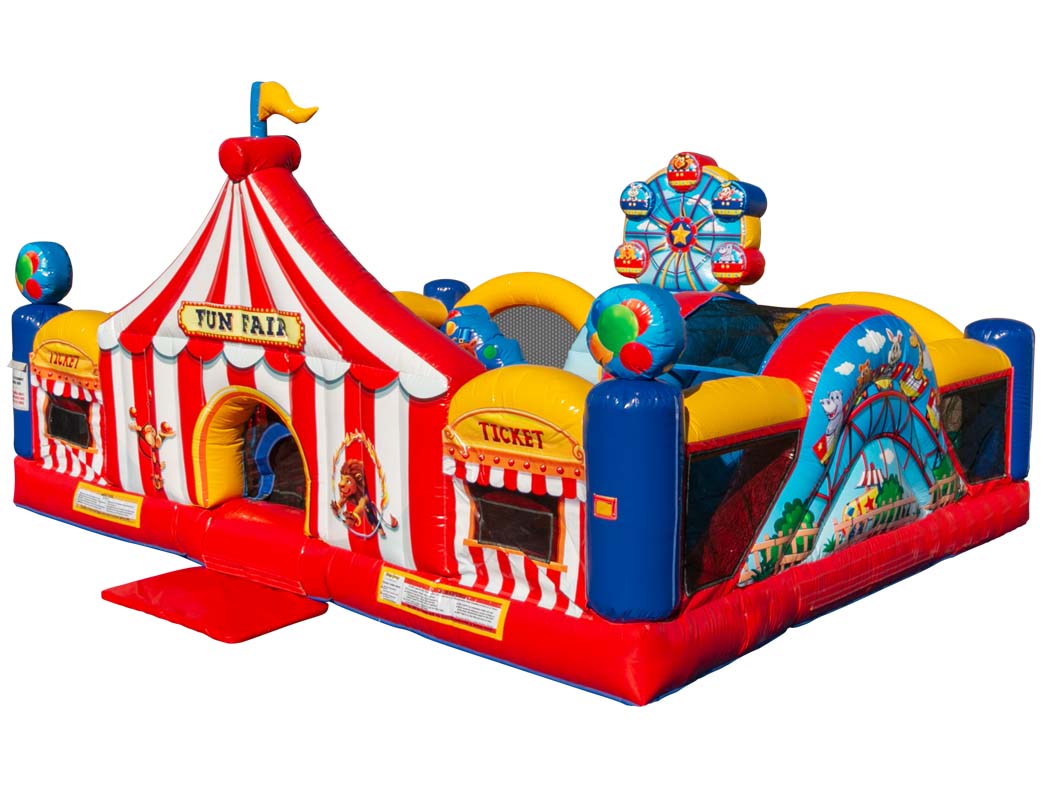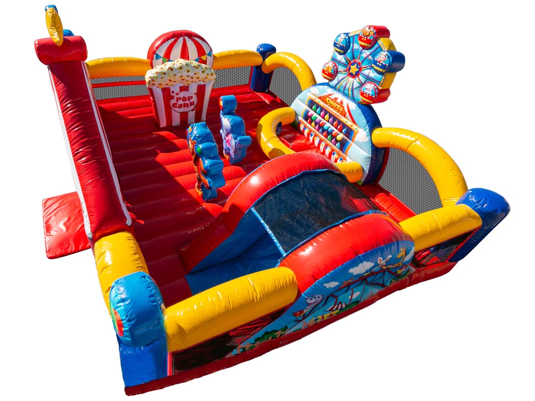 Our Fun Fair Toddler Combo brings a fun carnival theme to any party or event. This unit features realistic 3D artwork including a giant Ferris wheel and roller coaster, a circus tent with friendly animals and a life-sized tub of popcorn!